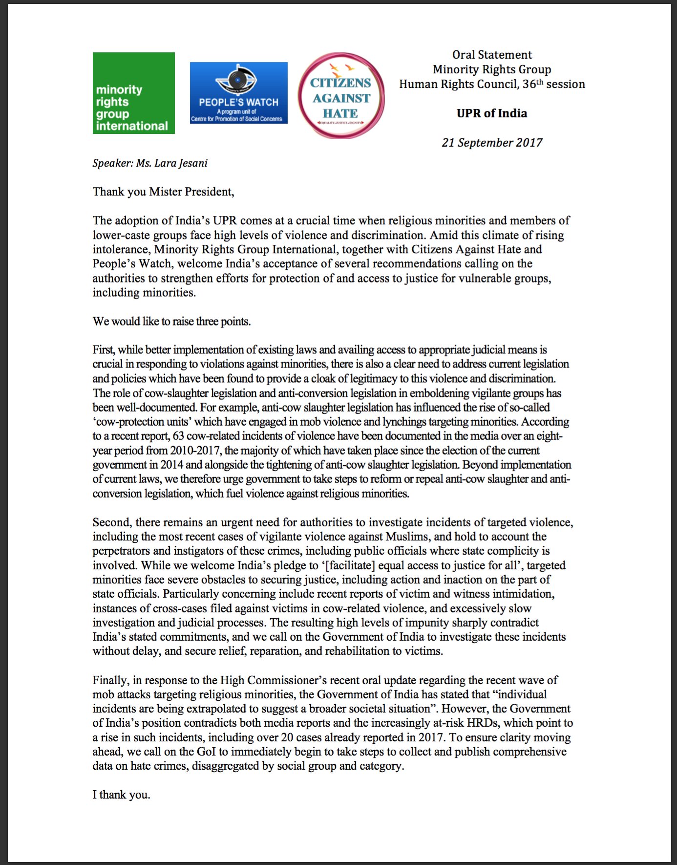 - CAH join statement at United Nation’s Human Right’s Council’s Universal Periodic Review of India – 21st September 2017 UPR Statement